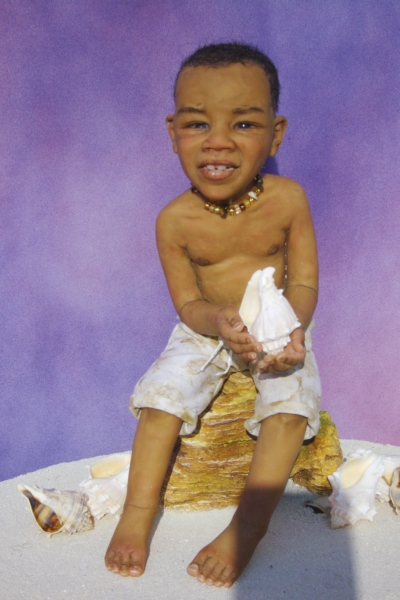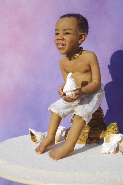 This piece depicts a Bahamian boy who is extremely pleased with his new finds. He is seated on a base with real Bahamian sand.