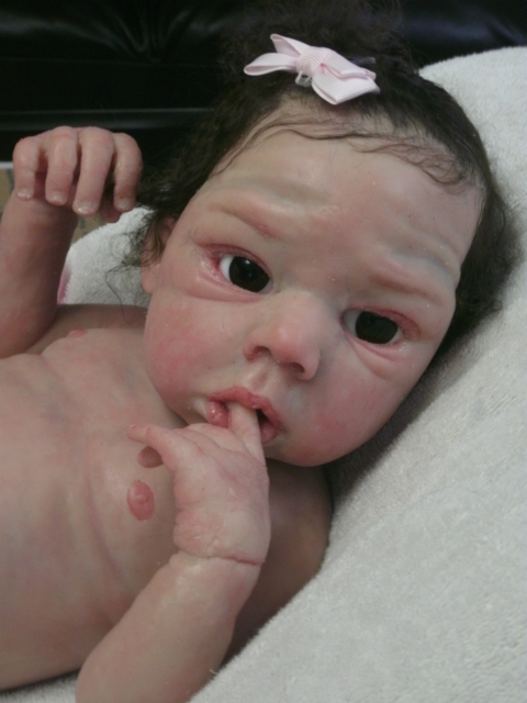 Spots now available! Meet my new, full body, baby girl, Spencer. Non-refundable deposit is required. She is 20.5 inches and will be an edition of 15 babies worldwide plus 2 artist proofs. Poured in soft platinum ecoflex. This baby promises to be super cuddly. All of my babies are poured in one piece. Her head will turn naturally and she will have my signature armature in her arms only. Available in black, olive, and light caucasian skintones with your choice of hair and eyes. 6 month layaway is available. This beautiful baby girl will come home with a beautiful layette and other goodies. Please email me to confirm availability. |