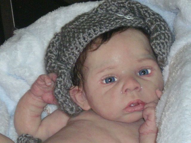 Hi everyone, I am so happy to introduce you to my sweet little baby boy, Wyatt! I'm thrilled with the way he turned out! He will be an edition of 15 worldwide plus 2 artist proofs which will go to Ebay. He is poured in one piece. No jointed head here, as the soft silicone allows his head to naturally turn just like a real baby. He is 19.5 inches long if he were stretched out. His head circumference is 14.5 inches. His legs are cutely tucked in and his back is rounded to make him extra cuddly. Of course he features my special armature in his arms only. He will be poured in Eco 20. You have a skintone choice of olive or light Caucasian and your choice of eye and hair color. He will be able to take a full pacifier as he has a fully detailed inner mouth. Wyatt will come home with a beautiful layette set. SOLD OUT |